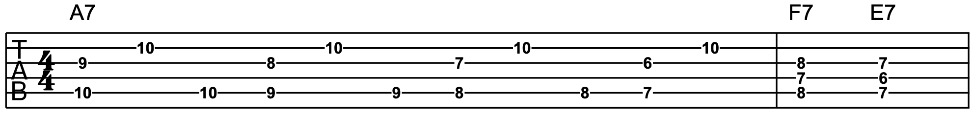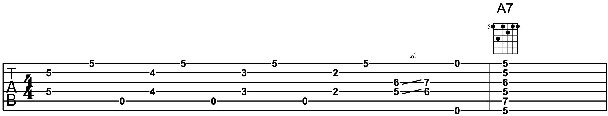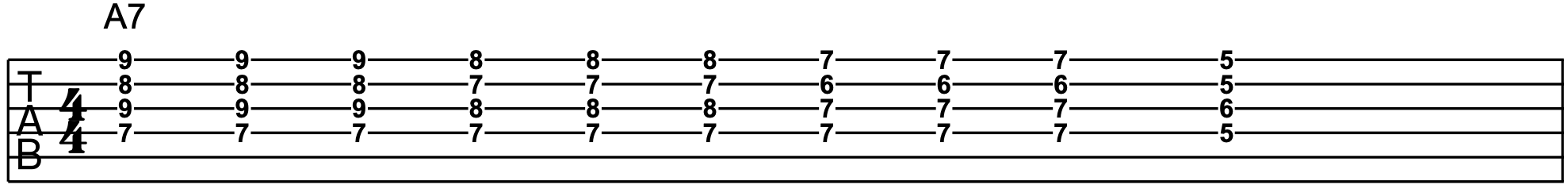 In Riff 3, we have a descending chord riff. It starts on one voicing of A7, and ends on other voicing of A7.