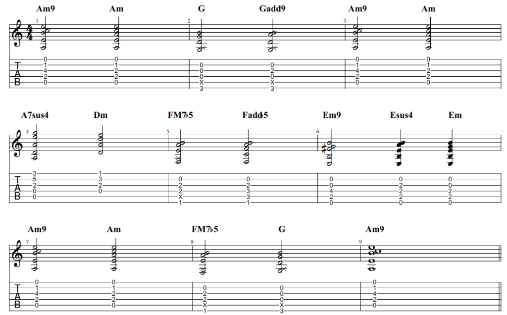 It begins with Am9 resolving to Am, where the added 9th creates tension that naturally pulls toward the simpler A minor chord. From there, the progression moves to Gadd9, which adds color and a slightly unresolved feeling that helps the harmony flow forward.