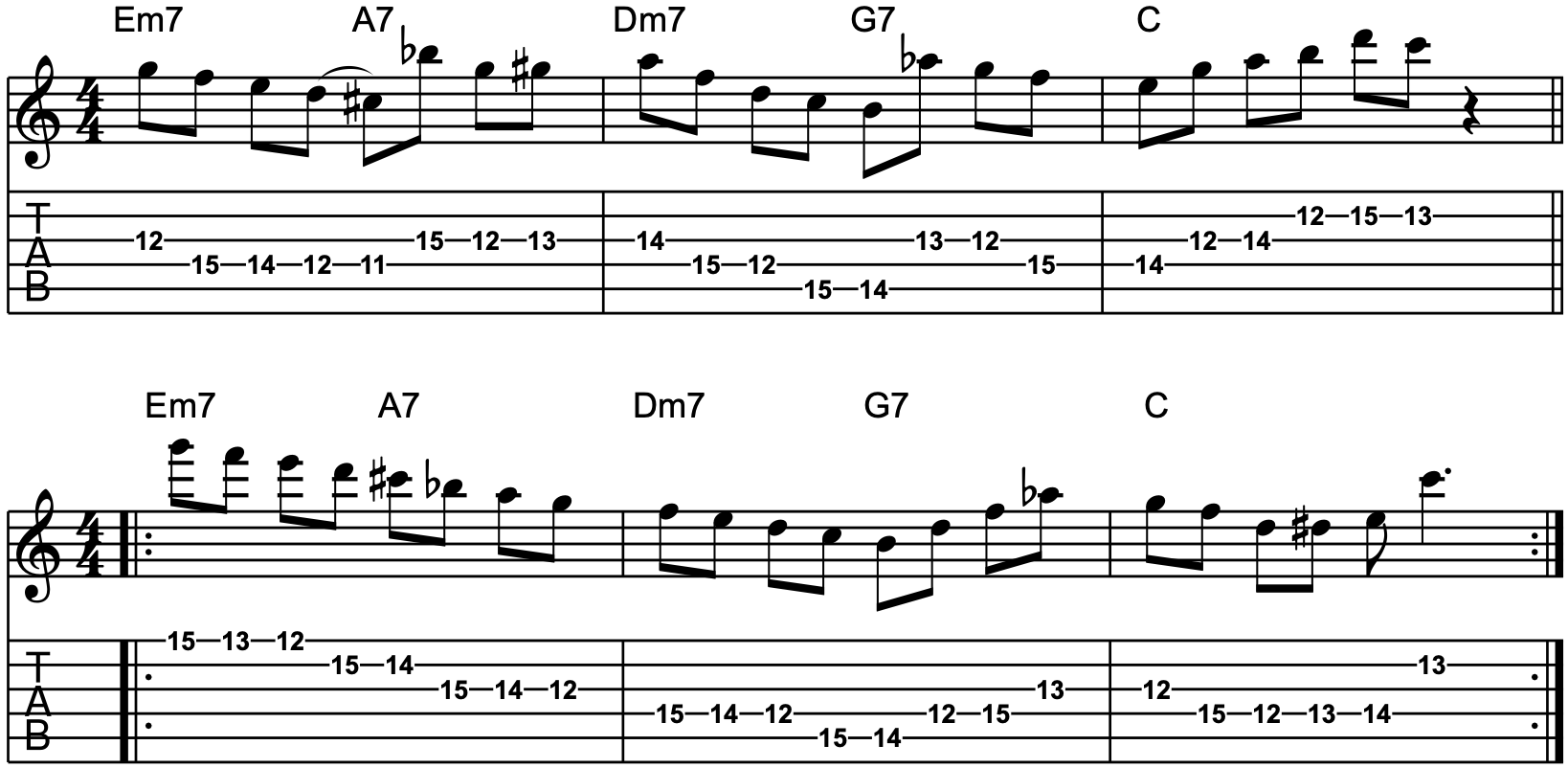 Below, while a lot of the notes fit into the C Major Scale, we're really thinking about this on a chord-by-chord basis, and using some chromatic approach notes.