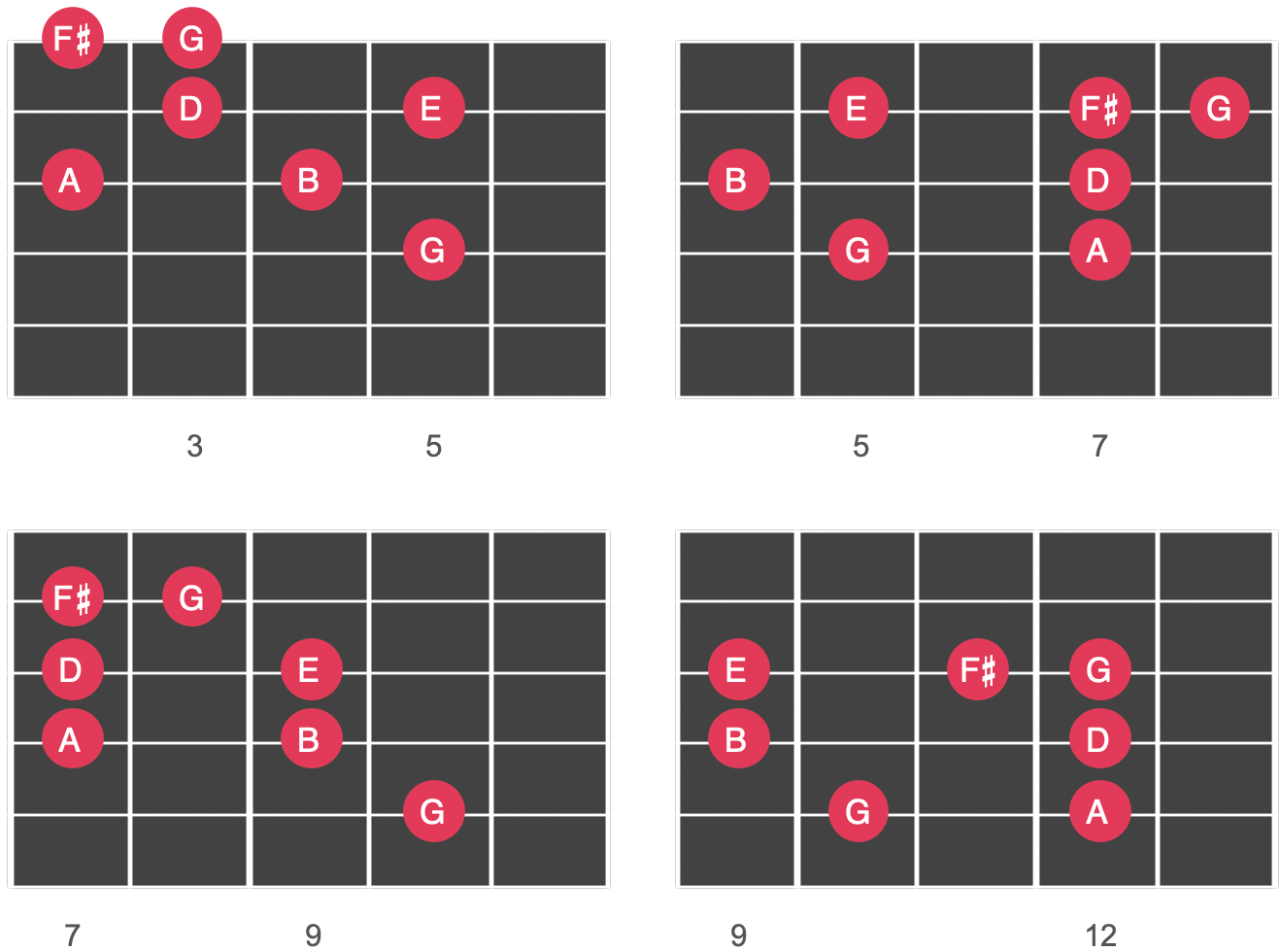 Below, we'll first look at 4 different ways to play a G major hexatonic scale. Then, we'll look at a few riffs based on this scale.
